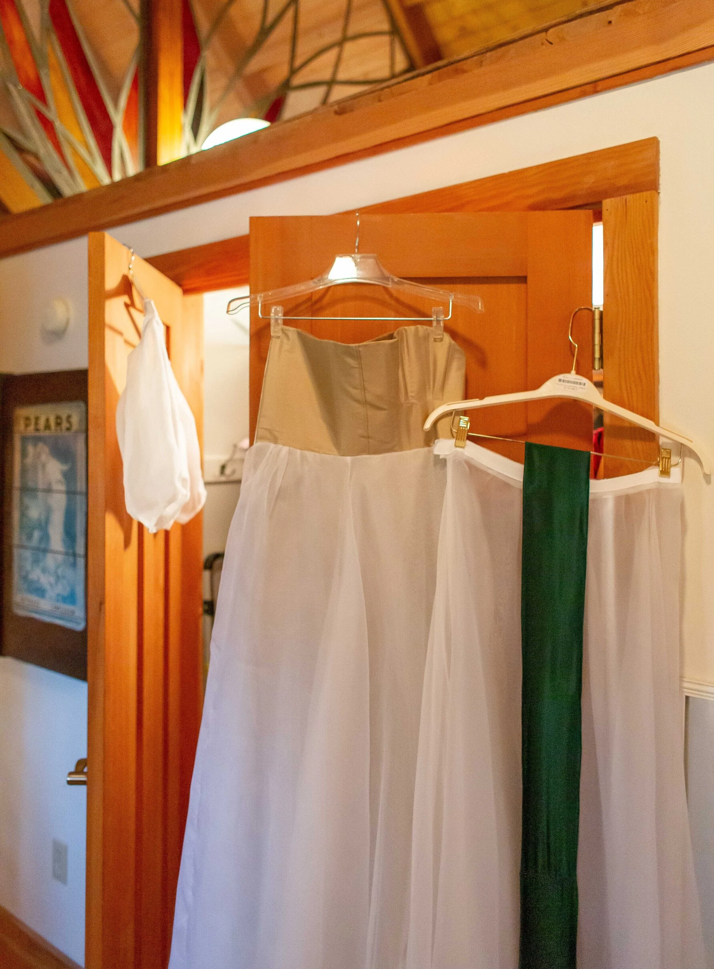 Wedding gown in silk organza with pleated front closure, pleated waistband, 18th-century sleeves, fan back skirt, and green silk charmeuse sash.