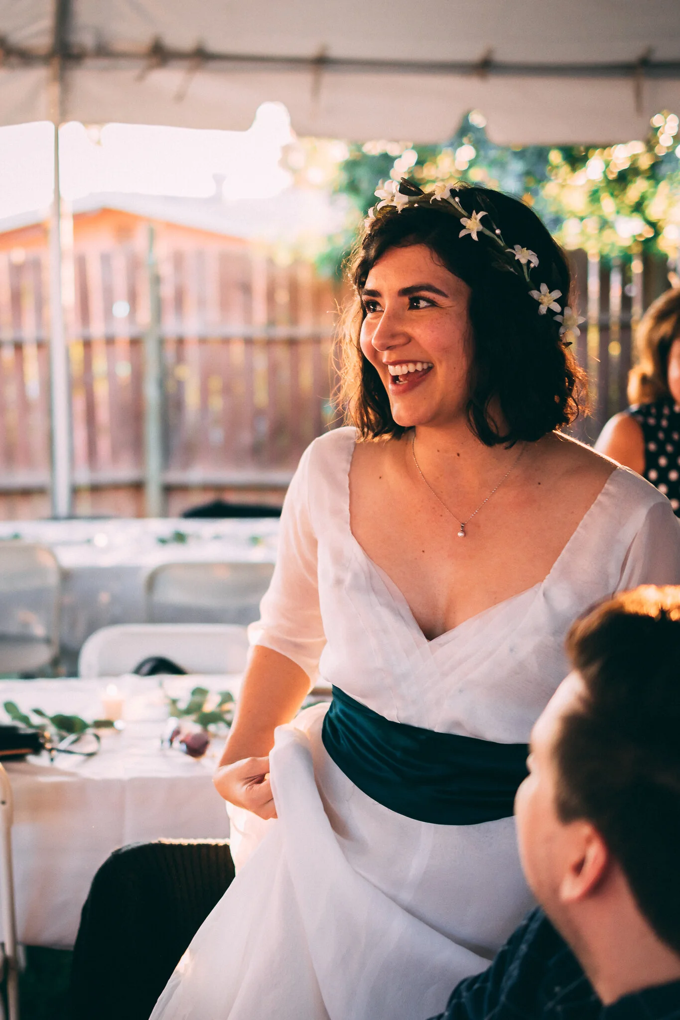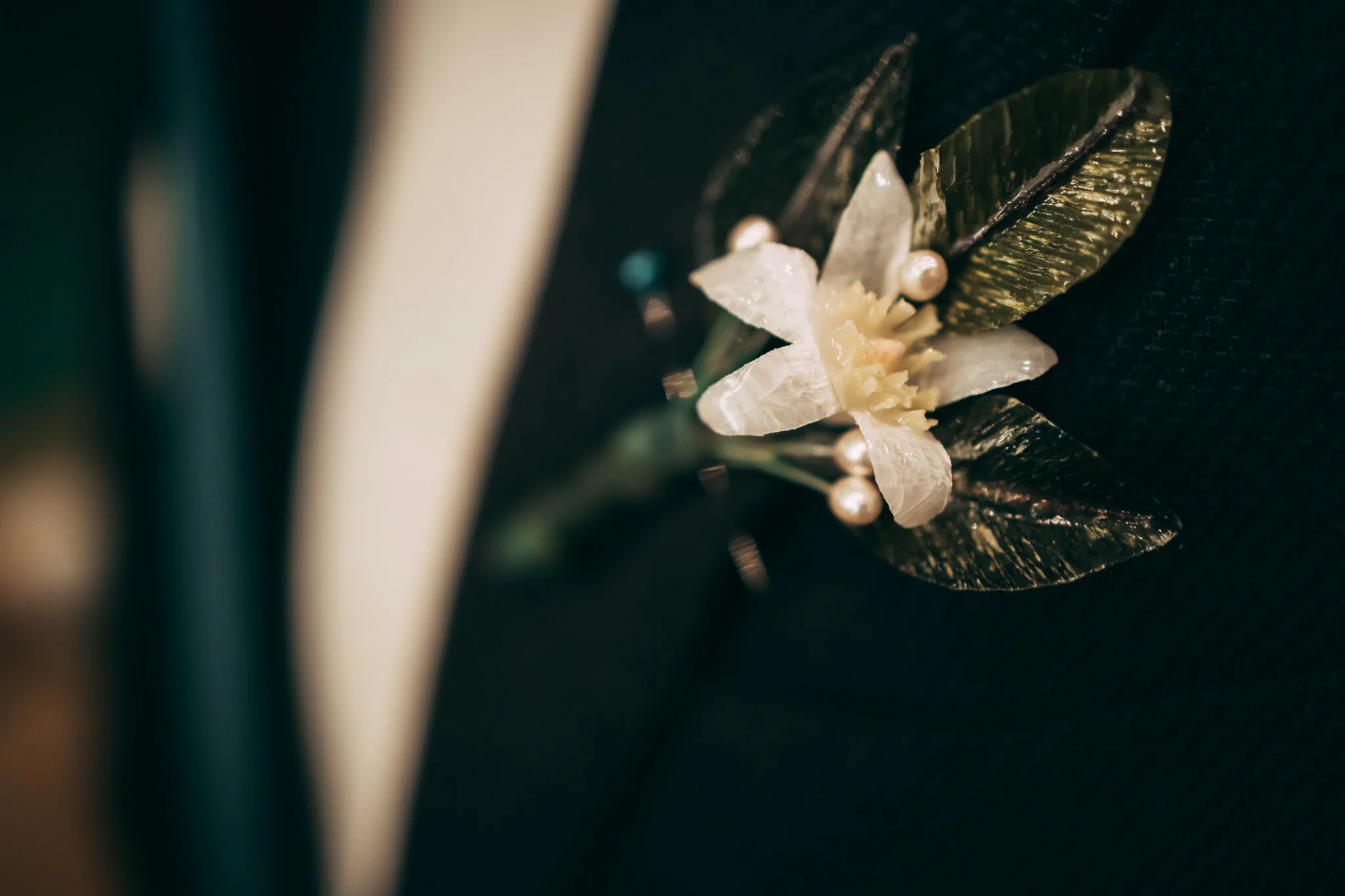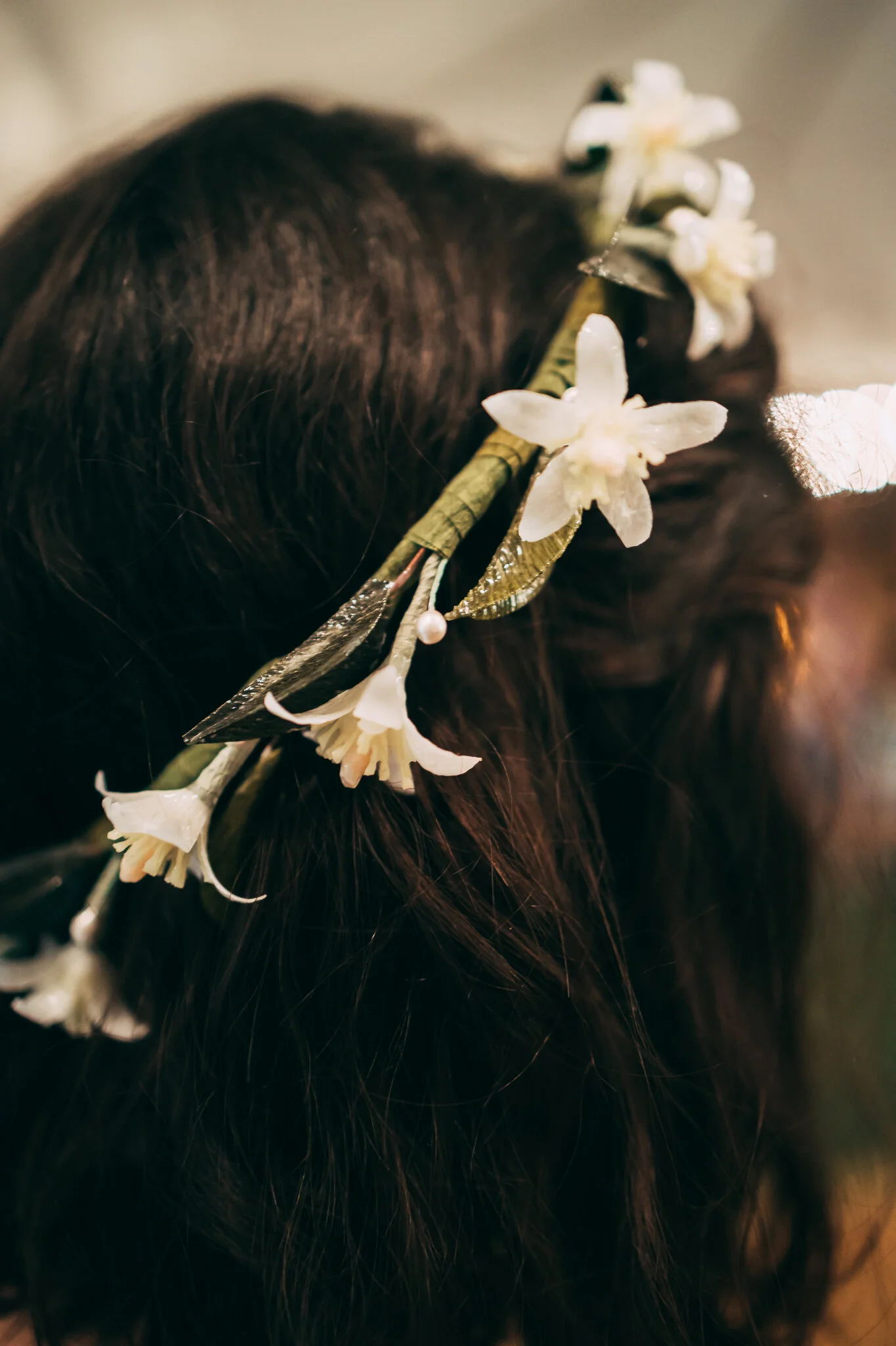 The Waxed Paper Orange Blossom crown was handmade with the Castle in the Air Paper Flower Crown kit. Boutonniere was created by same method, then wrapped in green silk ribbon.
