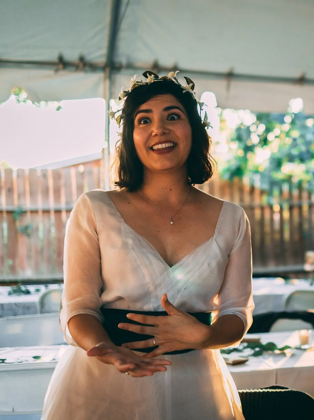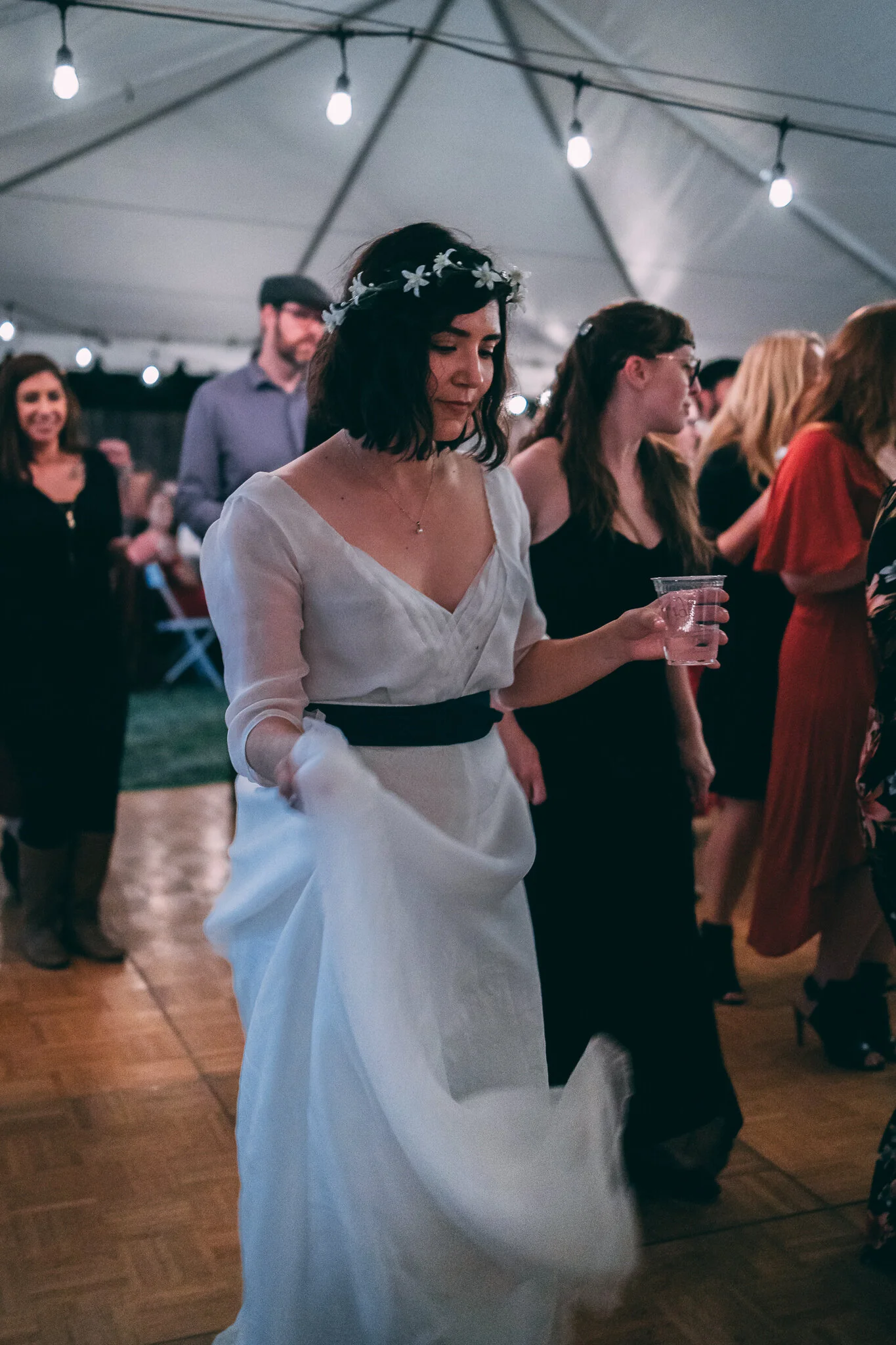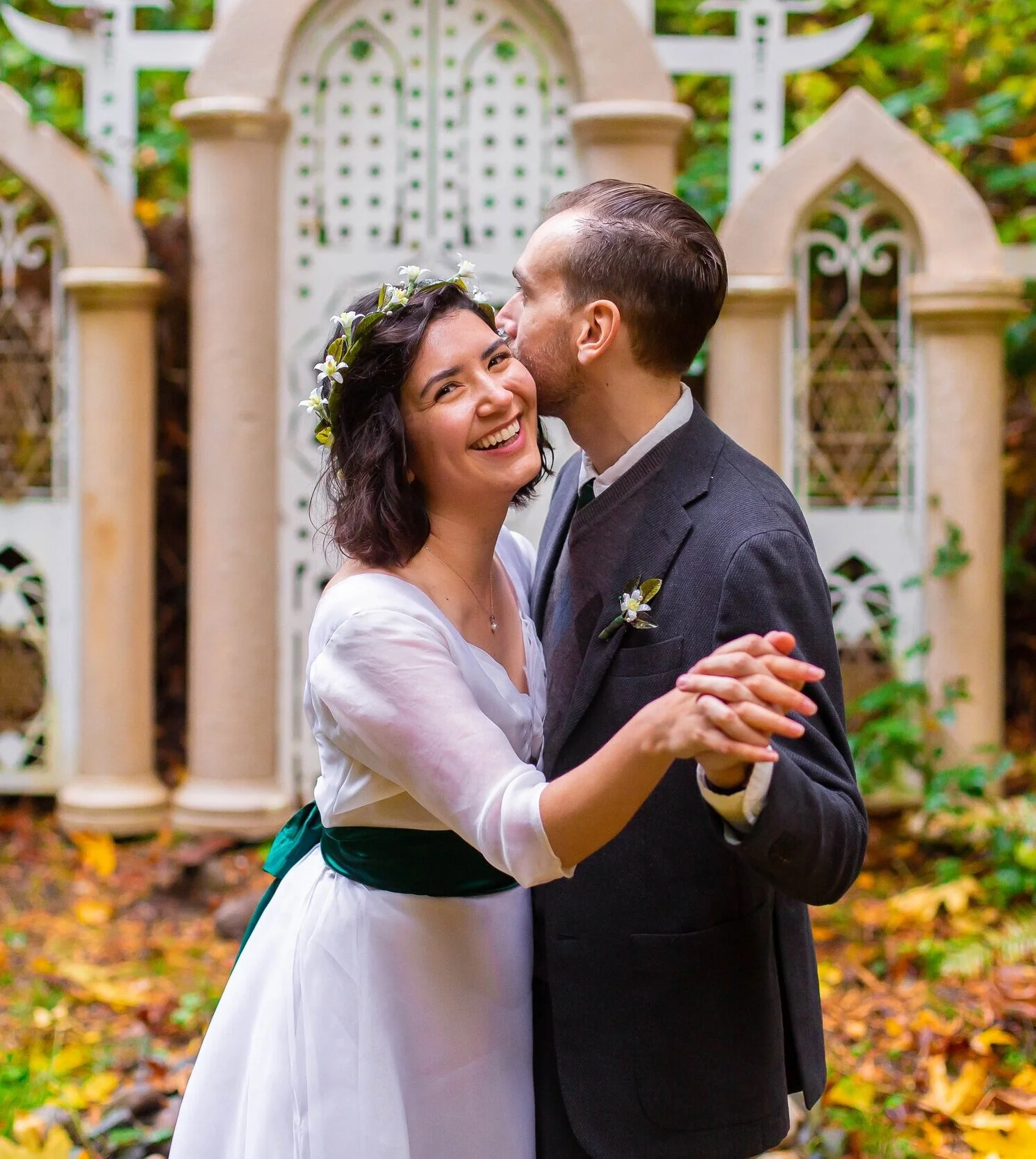 The Waxed Paper Orange Blossom crown was handmade with the Castle in the Air Paper Flower Crown kit. Boutonniere was created by same method, then wrapped in green silk ribbon.
