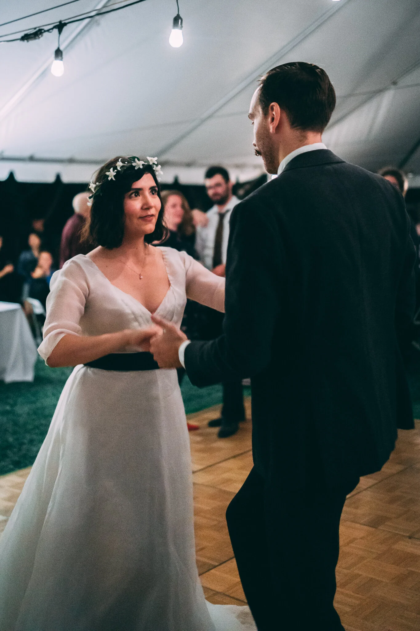 The skirt was drafted with an extant pattern from the early 20th century for a flat-front, fan back shape. Skirt is comprised of the tan silk base, two layers of white tulle, and three layers of silk organza. The silk base, tulle, and two layers of organza were sewn to the foundation layer, while the top layer of silk organza is sewn to the bodice with a side-front closure.